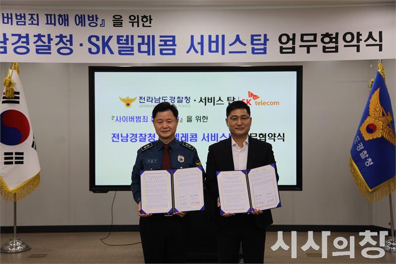 전라남도경찰청 사이버범죄수사대는 5일 SK텔레콤 서비스탑과 ‘사이버범죄 예방과 정보통신 기술 교류’를 위한 업무협약을 체결했다.