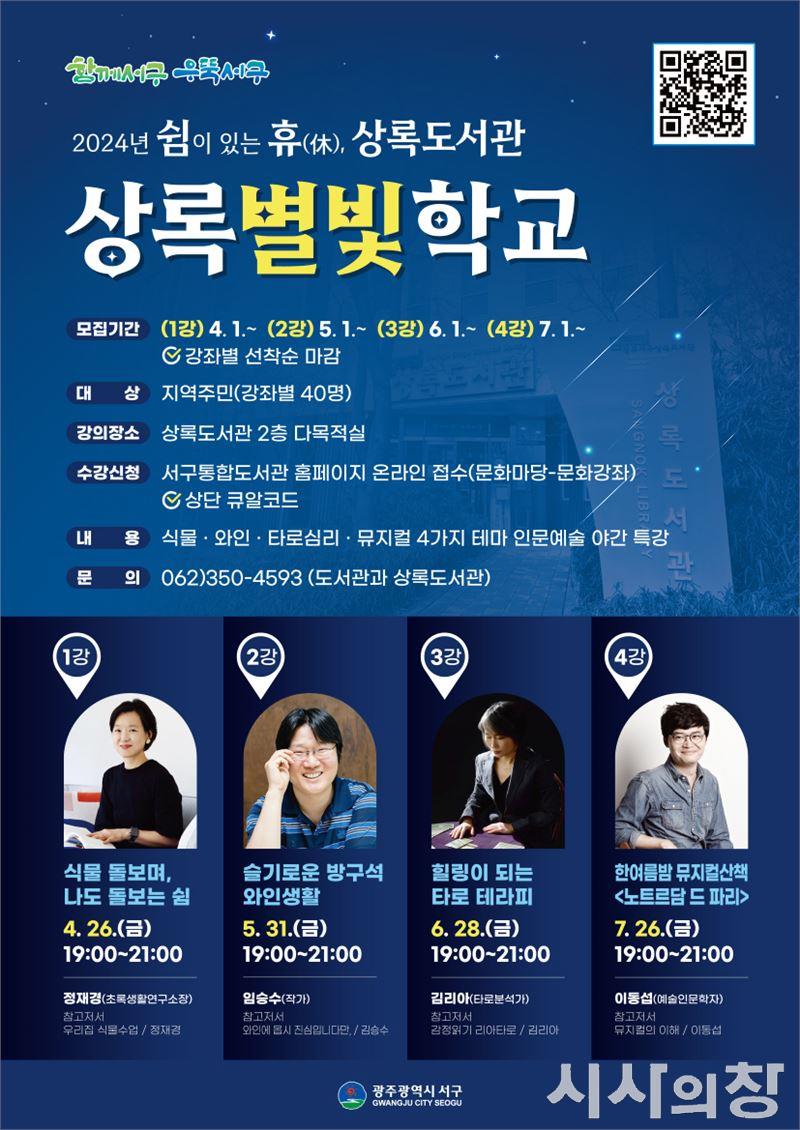 광주광역시 서구는 오는 7월까지 매월 마지막 주 금요일 상록도서관에서 인문예술 야간 특강‘상록별빛학교’를 운영한다.
