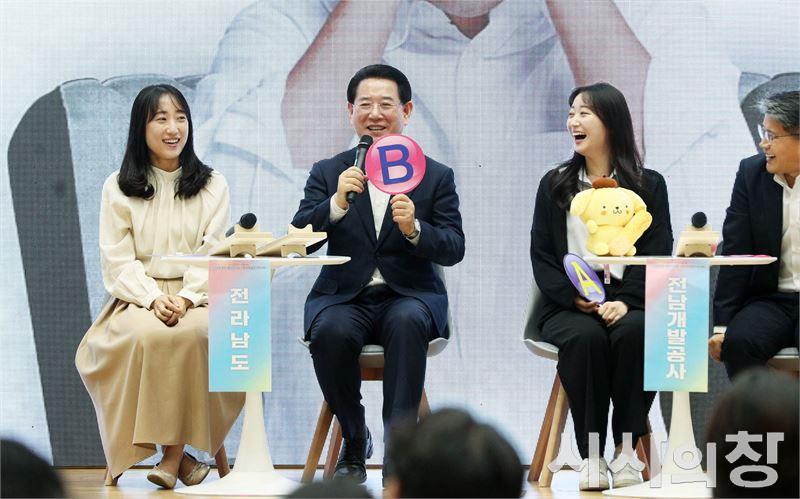 전라남도는 5일 도청 왕인실에서 ‘저출생과 지방소멸 극복, 일·생활균형이 답이다’라는 슬로건으로 도 공사·출연기관 일·생활균형 실천 다짐대회를 개최, 일과 생활이 균형을 이루는 직장문화 확산에 함께하기로 했다. 사진은 세대 간 일·생활균형에 대한 생각의 차이를 이해하고 다름을 존중하기 위한 세대공감 토크를 하고 있다.