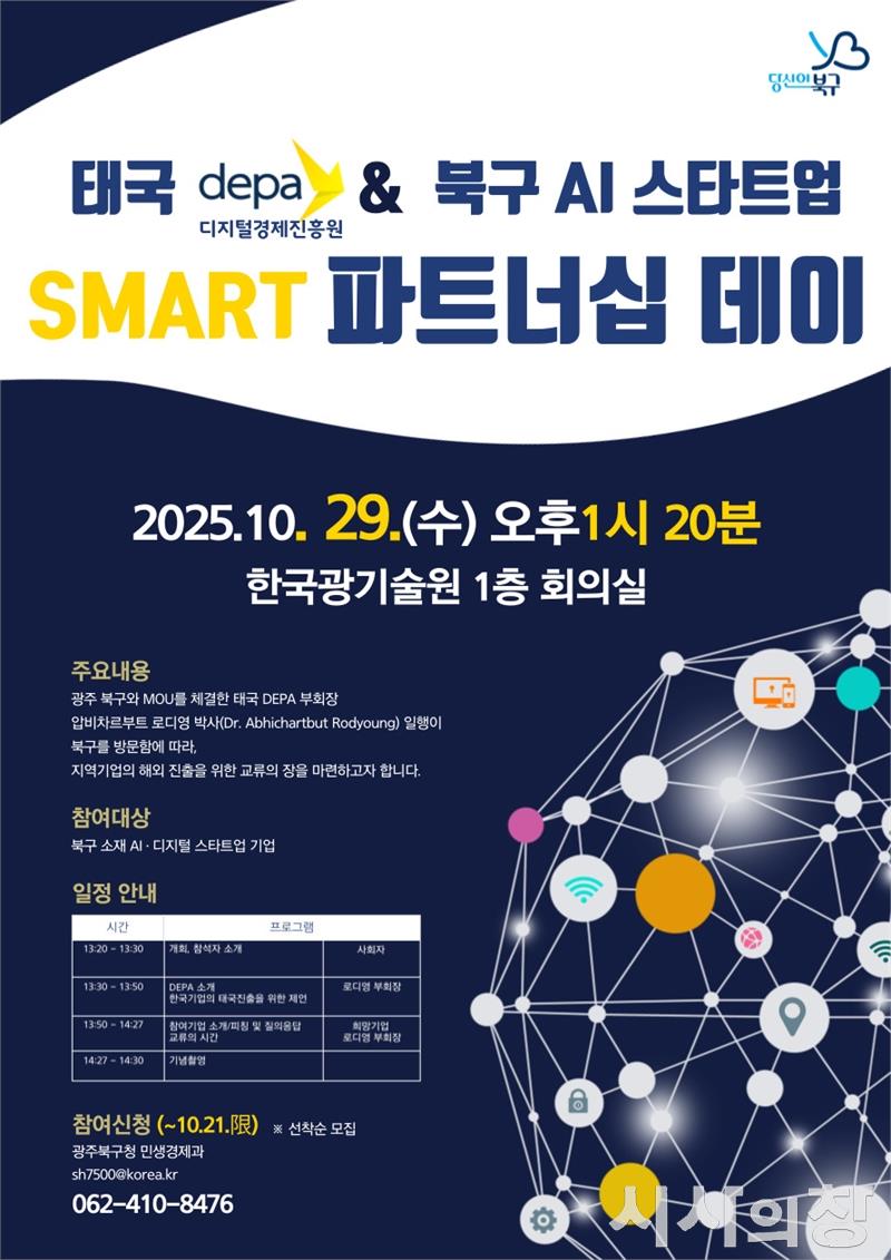 [시사의창=송상교기자] 광주광역시 북구가 지역 유망 AI 기업의 해외 진출을 지원하기 위해 태국 디지털경제진흥원(DEPA)과 협력의 장을 연다. 광주광역시 북구(구청장 문인)는 오는 29일 한국광기술원에서 태국 디지털경제진흥원(Digital Economy Pro