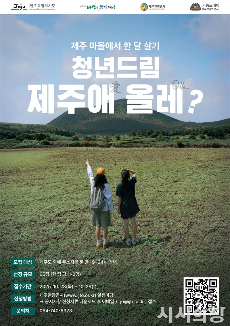 [시사의창=송상교기자] 제주시와 제주관광공사(사장 고승철)가 도외 청년을 대상으로 제주에서 한 달간 머물며 지역 문화를 체험하는 프로그램 ‘2025 청년드림, 제주애(愛) 올레(Olle)?’ 참가자를 모집하고 있다. 26일 제주시와 제주관광공사에 따르면 이번 사업은 제주 고향사랑기부제 지정 기부금 사업의 일환으로 추진