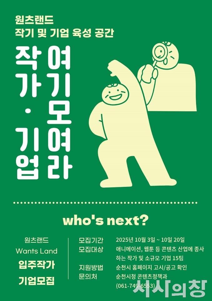 [시사의창=신민철 기자] 순천시(시장 노관규)가 지역 문화콘텐츠 산업을 활성화하기 위해 ‘문화콘텐츠 작가 및 소규모 기업 육성 공간’ 입주자를 모집한다. 신청 기간은 오는 20일까지다. 이번 모집은 애니메이션, 웹툰 등 콘텐츠 분야에서 활동 중이거나 창작을 준비 중인 예비·기성 작가와 소규모 기업 15개 팀을 대상으로