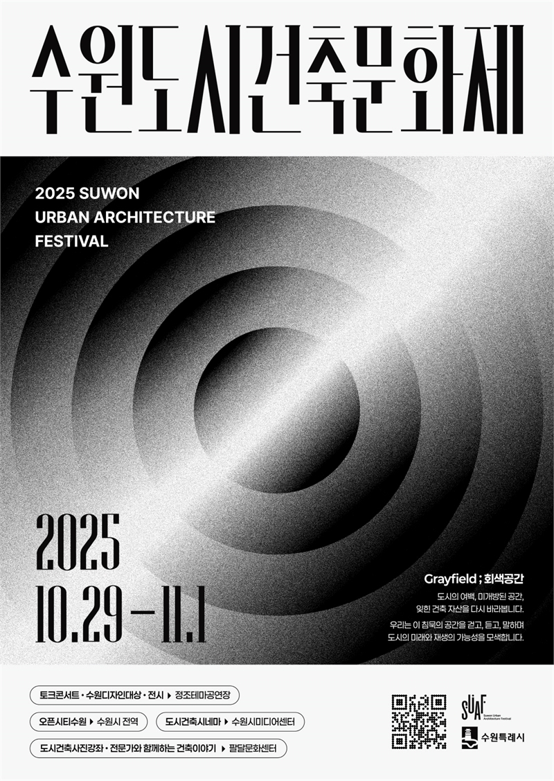 [시사의 창=조상연 기자] 수원특례시는 10월 29일부터 11월 1일까지 정조테마공연장, 수원시미디어센터, 팔달문화센터 등에서 ‘2025 수원도시건축문화제’를 연다. 올해 주제는 ‘Grayfield; 회색공간’으로, 미개방된 공간과 잊힌 건축 자산을 전문가와 함께 다시 바라보며 도시의 미래와 재생 방향을 모색하는 장으로