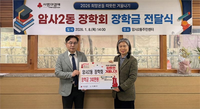[시사의창=김성민 기자] 강동구 암사2동이 ‘2026 희망온돌 따뜻한 겨울나기’ 캠페인과 연계해 지역 학생들에게 장학금을 전달했다. 전달식은 1월 8일 열렸고, 암사2동장학회가 주관했다.이번 장학금은 관내 학생 3명에게 돌아갔다. 고등학생 2명과 대학생 1명을 선발해 장학증서와 장학금을 건넸다. 장학회는 학생들의 학업