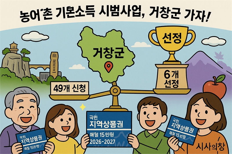 [시사의창=이태헌 기자] 농림축산식품부의 농어촌 기본소득 시범사업 공모에 전국 49개 군이 신청(선정 6개 내외)해 경쟁률 8.2대1을 보인 가운데, 경남에서는 거창·남해·함양 3개 군이 도전장을 냈다. 정부는 10월 중 서류·발표평가를 거쳐 대상지를 발표한다.핵심 변수는 재정 분담 구조와 사업계획의 실현 가능성이다. 경