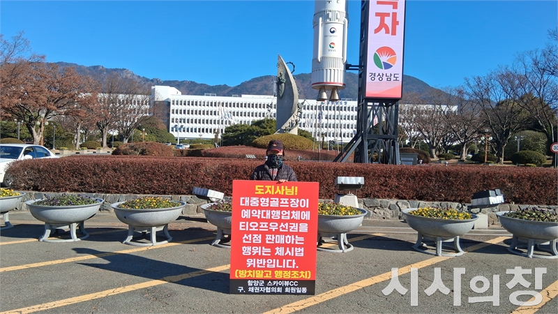 [시사의창=이태헌 기자]경남 함양 스카이뷰CC의 구 회원(회원채권명의자)들이 함양군청에 이어 경남도청 앞에서도 릴레이 1인 시위를 이어가고 있다.18일 경남도청 정문 앞에서는 스카이뷰CC 구 회원들이 번갈아 가며 1인 시위를 벌였다. 이들은 피켓을 통해 “도지사님! 대중형골프장이 예약대행업체에 티오프우선권을 선점 판매하는