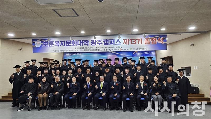 [시사의창=송상교기자] 보훈복지문화대학 광주캠퍼스가 국가유공자의 배움과 헌신을 기리는 뜻깊은 자리를 마련했다. 광주지방보훈청(청장 김석기)은 "12월 4일 오전 10시 보훈복지문화대학 광주캠퍼스 복지회관에서 2025학년도 졸업식과 결혼앨범 전달식(리마인드 웨딩)을 성황리에 개최했다"고 밝혔다. 이번 행사는 상이군경