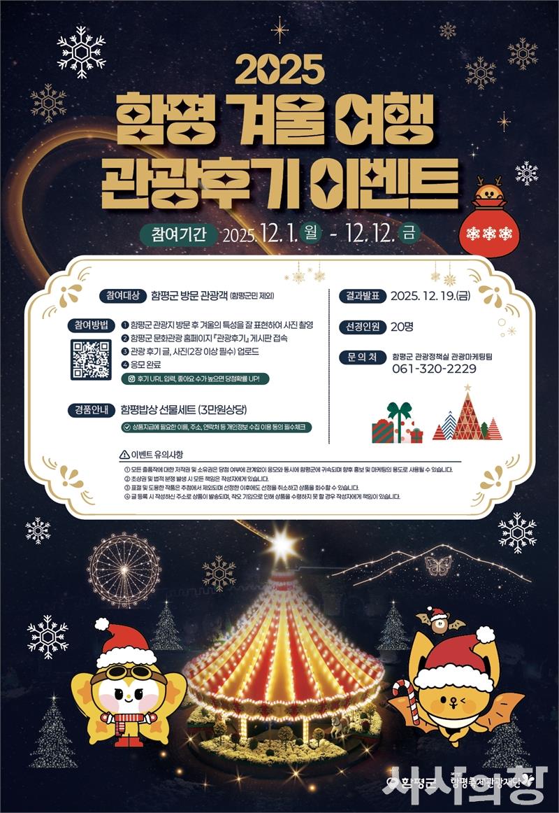 [시사의창=오명석 기자] 전남 함평군(군수 이상익)이 겨울철 지역 관광자원을 널리 알리고 관광객 참여를 확대하기 위해 ‘함평 겨울 여행 관광 후기 이벤트’를 진행한다. 겨울빛축제의 뜨거운 관심을 이어가며 겨울 시즌 함평 관광의 체감도를 한층 높이는 참여형 프로그램으로 운영된다. 함평군에 따르면 이번 이벤트는 오는