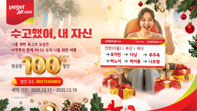 [시사의창=김성민 기자] 베트남 최대 민간 항공사 비엣젯항공이 연말 항공권 특가전의 전면에 섰다. 비엣젯항공은 한국시간 기준 12월 17일 오전 2시부터 12월 20일 오전 1시까지, 프로모션 코드 ‘BIGTHANKS’를 입력하면 에코(Eco) 클래스 운임을 최대 100%까지 할인하는 한정 판매를 진행한다. 할인은 운임