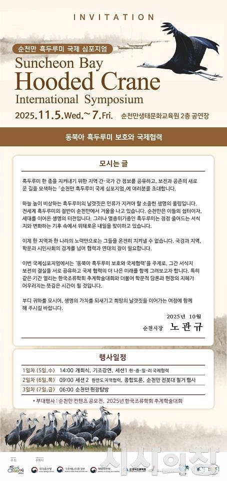 [시사의창 = 신민철 기자] 순천시(시장 노관규)는 "오는 11월 5일부터 7일까지 3일간 순천만생태문화교육원과 순천만습지 일원에서 「2025 순천만 흑두루미 국제심포지엄」을 개최한다"고 27일 밝혔다. 이번 심포지엄은 ‘동북아 흑두루미 보호와 국제협력’을 주제로 열리며, 한국·중국·일본·러시아 등 4개국의 조류 전문