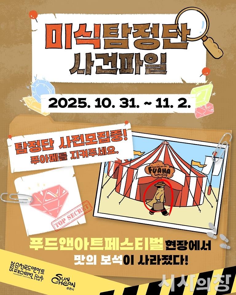 [시사의창 = 신민철 기자] 순천시(시장 노관규)는 "오는 10월 31일부터 11월 2일까지 3일간 열리는 ‘푸드앤아트페스티벌’의 일환으로 방탈출형 미식투어 프로그램 「미식탐정단, 맛의 보석을 찾아라!」를 운영한다"고 27일 밝혔다. 이번 프로그램은 ‘푸드앤아트페스티벌에서 도둑맞은 맛의 보석을 찾아라!’라는 흥미