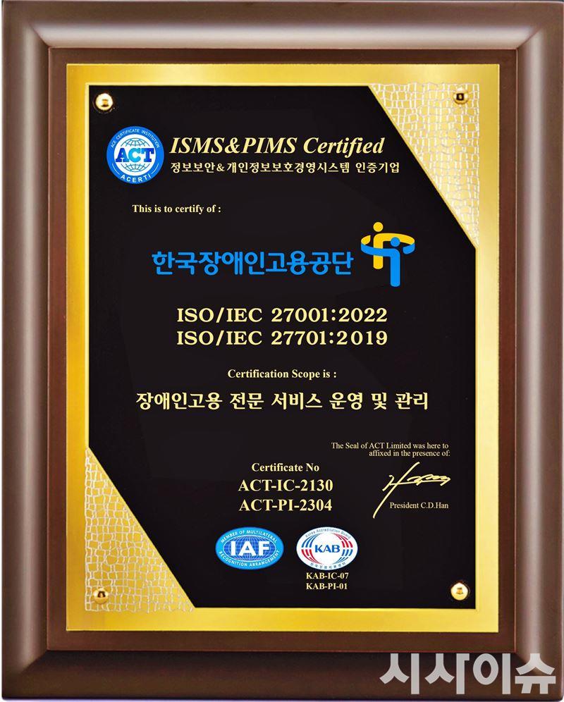 한국장애인고용공단은 고용노동부 산하기관 중 최초로 “정보보호경영시스템(ISO 27001_2022)”과 “개인정보보호경영시스템(ISO 27701_2019)”을 동시 획득했다.