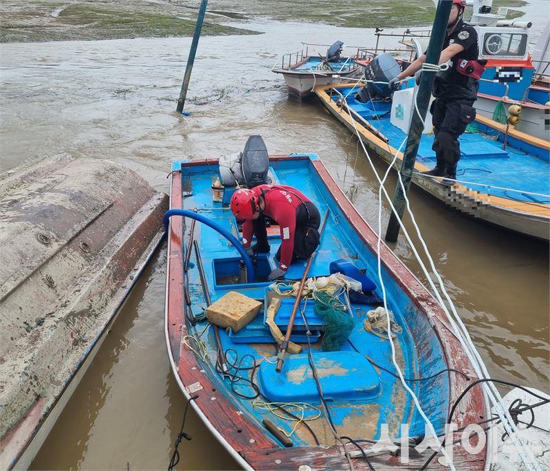 신고를 받은 목포해경은 파출소 구조팀과 서해해양특수구조대를 현장에 급파, 침수가 진행된 어선 A호(1.85톤, 무안선적)을 비롯한 선박 7척의 침몰 방지를 위해 신속하게 홋줄 보강작업을 실시했다.