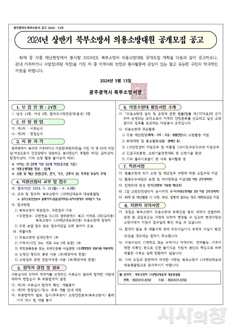 [시사의창=송상교기자] 광주광역시 북부소방서(서장 송성훈)는 “소방 안전에 관심이 있고 시민의 안전을 위한 봉사활동에 적극 동참할 신규 의용소방대원을 공개 모집한다”고 22일 밝혔다.
