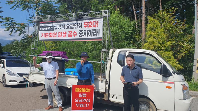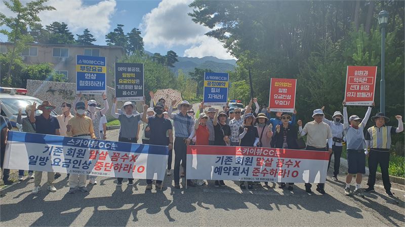 이 골프장 기존 회원 80여 명은 7일 함양군 서상면 대남리 스카이뷰CC 골프장 입구에서 골프장 측의 일방적인 요금인상과 예약질서를 지키지 않는 횡포를 중단할 것을 요구하며 규탄 집회를 가졌다.
