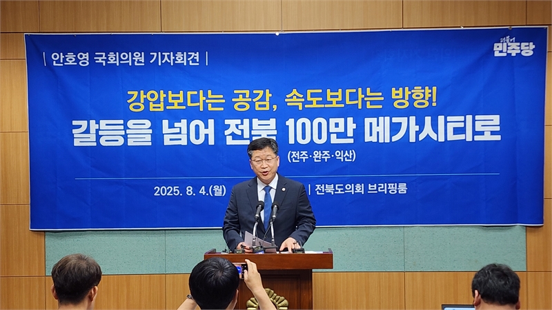 더불어민주당 안호영 국회 환경노동위원장(완주·진안·무주)이 전주‧완주 행정통합 파열음을 “갈등을 키우는 정치”로 규정하며 정면 돌파에 나선 것이다. 그는 기조발언부터 “지금 필요한 건 일방통행식 통합이 아니라 협력과 상생”이라며, ‘전주·완주·익산을 한 생활·경제권으로 묶는 전북형 100만 메가시티’ 구상을 쏟아냈다.