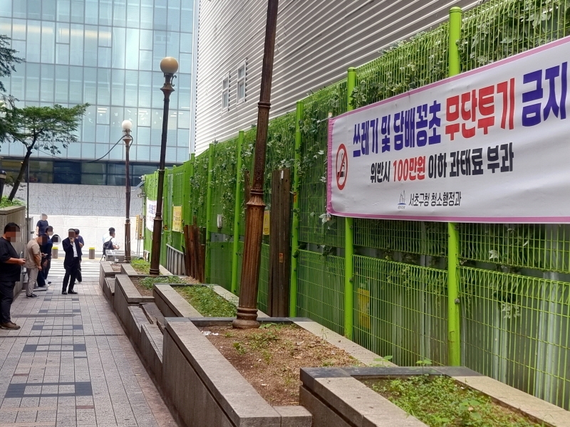 강남역 사거리에서 양재 방면으로 도보 2~3분 거리에 대로변 옆으로 좁은 골목길들이 있다. 예상대로 어김없이 흡연자들이 흡연을 하는 비공식적 흡연 장소다. 하지만 골목 곳곳에는 흡연금지와 꽁초투기 금지를 알리는 여러 개의 현수막과 CCTV까지 설치되었지만, 흡연자들은 아랑곳하지 않고 담배를 피우고 있었다. 그러던 도중 60대 후반에서 70대 초반 정도로 보이는 남성 두 명이 ‘무단투기단속’이라는 글귀가 새겨진 조끼를 입은 채 해당 골목 앞에 서 있었다. 그래서 기자는 “꽁초 무단투기 단속을 하나보다”하고 단속 장면을 사진 찍으려 준비하고 있었지만, 이상하게도 단속원들은 흡연자들을 쳐다보더니 그냥 지나치는 것이었다. 흡연자들이 너무 많아 그냥 포기하고 가는 듯 보였다.