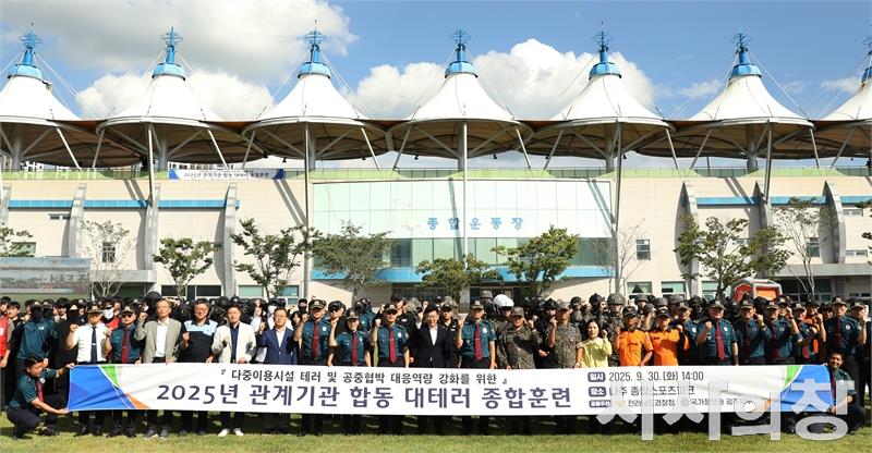 전라남도경찰청은 나주종합스포츠파크에서 국가정보원(광주지부), 육군 제31보병사단, 제11공수특전여단, 공군 제1전투비행단, 전남소방본부, 영산강유역환경청 등 10개 기관 250여명이 참여한 가운데 관계기관 합동 대테러 종합훈련을 실시햇다.[시사의창=송상교 기자]
