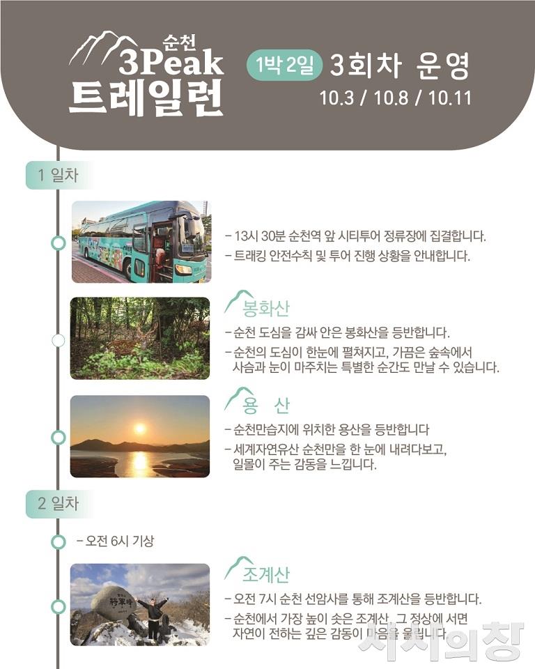 ‘순천 쓰리픽스 트레일런’은 봉화산, 용산, 조계산을 잇는 도전형 산행 프로그램으로, 참가자들은 봉화산 정상에서 내려다보는 순천 도심 전경, 순천만 용산의 황홀한 일몰, 선암사를 품은 조계산의 고즈넉한 풍광을 함께 즐길 수 있다.