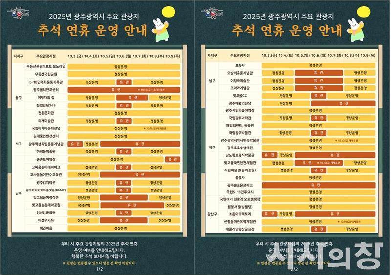 광주광역시 이승규 신활력추진본부장은 “광주에는 북적이지 않으면서도 감성과 여유를 즐길 수 있는 숨은 명소가 많다”며 “추석 연휴 시민과 관광객들이 광주의 가을 속에서 풍성한 힐링 시간을 보내길 바란다”고 말했다.