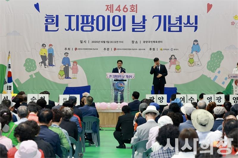 전라남도의회 김태균 의장은 10월 1일 광양국민체육센터에서 열린 ‘제46회 흰지팡이의 날 기념식’에 참석해 유공자 표창을 수여하고, 시각장애인과 자원봉사자들을 격려했다.[시사의창 = 송상교 기자]
