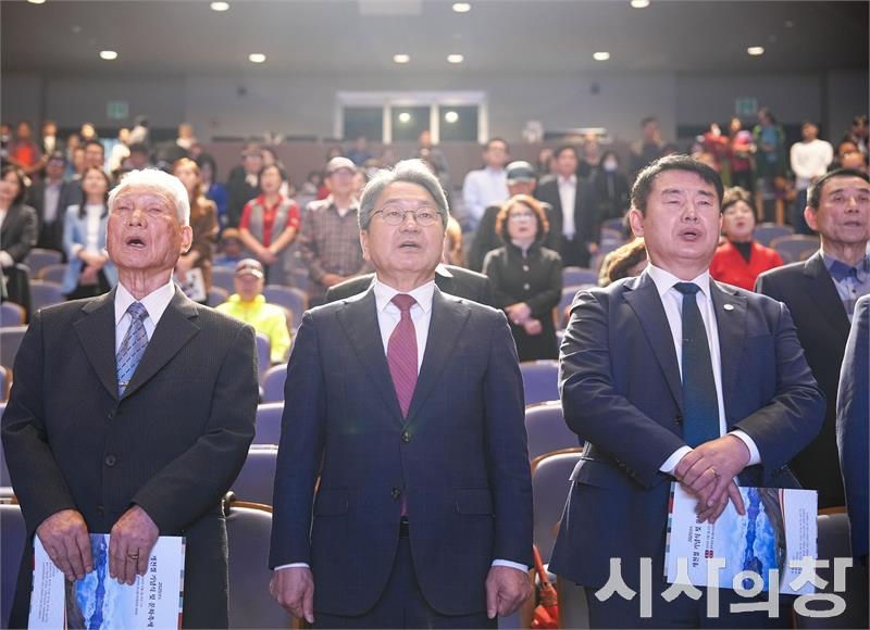 광주광역시 강기정 시장이 3일 오전 남구 빛고을시민문화관에서 열린 '단기 4358년 2025년 개천절 경축식'에 참석해 개천절 노래를 제창하고 있다.[시사의창=송상교 기자]