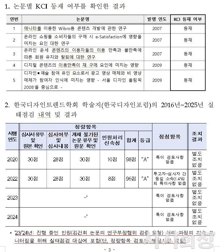 표절 및 위조 의혹을 받는 김건희 씨의 학술논문 5편이 여전히 한국연구재단의 한국학술지인용색인(KCI)에 등재돼 있는 것으로 확인됐다. 특히 김건희 논문 4편을 게재한 한국디자인트렌드학회는 2023년 4월 이후 지금까지 연구윤리위원회를 꾸리지 않고 단 한 차례도 검증 절차를 진행하지 않았다. 그럼에도 불구하고 학회는 KCI A등급을 유지하고 있어 관리·감독 시스템의 허점이 여실히 드러난 것이다.이미지는 확인여부 결과[시사의창=송상교 기자]