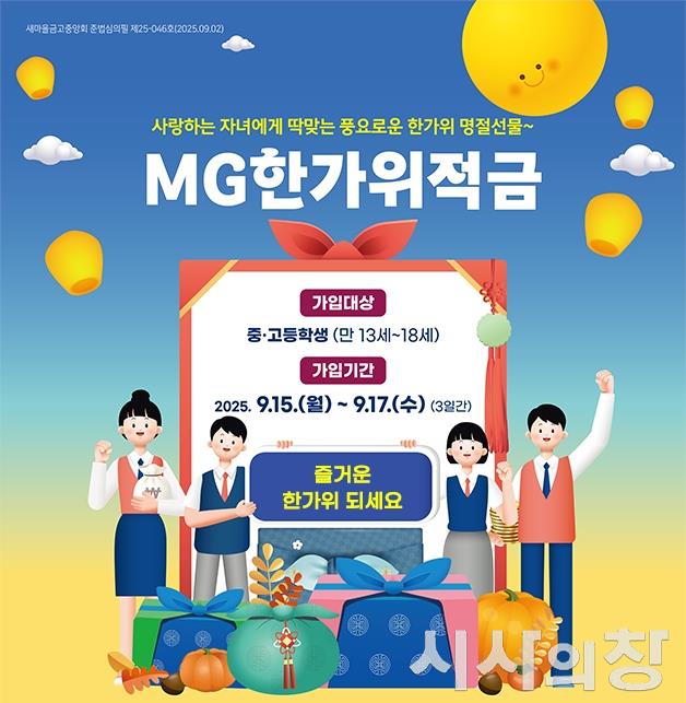 새마을금고중앙회는 추석을 맞이하여 청소년들의 올바른 금융 습관을 심어주기 위하여 출시한 “MG한가위적금”이 고객들의 관심과 성원에 힘입어 성황리에 판매 완료되었다고 3일 밝혔다.[시사의창=송상교 기자]