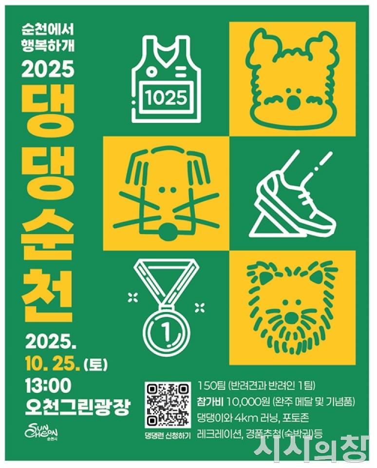 10월 25일에는 오천그린광장과 동천 일대에서 ‘댕댕순천’이 이어진다. 4km 코스를 달리는 메인 러닝 행사와 포토 미션, 스탬프 투어가 함께 진행되며 완주자에게는 기념품과 인증서가 수여된다. 현장에서는 반려견 의상 콘테스트, 럭키 퍼피 추첨 등 즐길 거리도 풍성해 반려인들의 참여 열기가 예상된다.