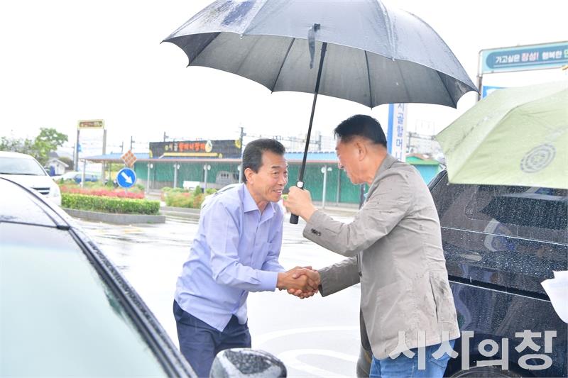 장성군이 추석 연휴 첫날인 3일 오전, 장성나들목 가축방역초소와 장성공영버스터미널, 장성읍 택시부를 방문해 현장 근로자들과 대중교통 종사자들을 격려하고 추석 인사를 전했다.사진은 김한종 장성군수가 3일 장성역 앞에서 택시기사와 명절 인사를 나누고 있다.[시사의창=송상교 기자]