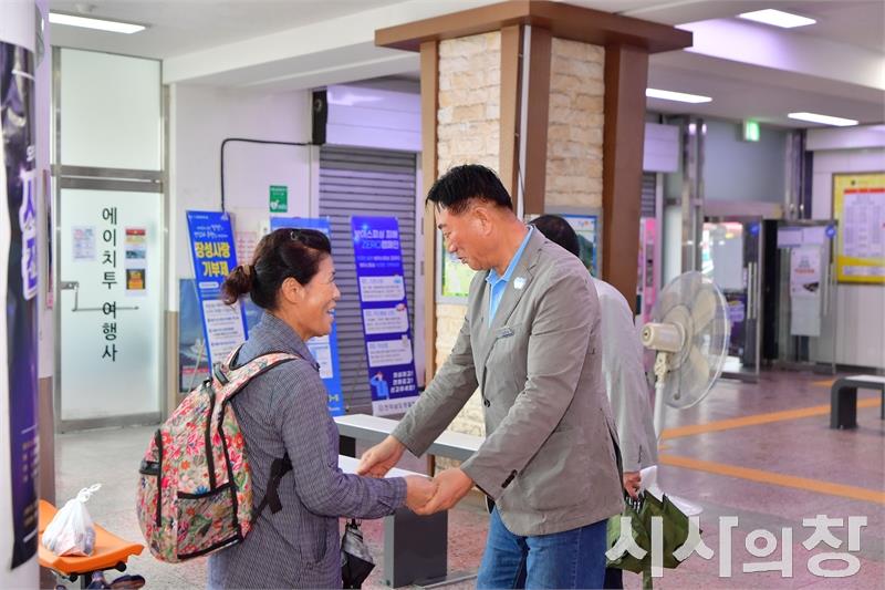 장성군이 추석 연휴 첫날인 3일 오전, 장성나들목 가축방역초소와 장성공영버스터미널, 장성읍 택시부를 방문해 현장 근로자들과 대중교통 종사자들을 격려하고 추석 인사를 전했다.사진은 김한종 장성군수가 3일 장성공영버스터미널에서 이용객과 인사하고 있다. [시사의창=송상교 기자]