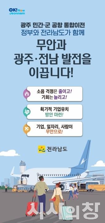전라남도는 전남·광주·무안의 상생과 도민의 오랜 염원을 이루기 위해 광주 민간·군 공항의 무안국제공항 통합이전을 ‘더 이상 미룰 수 없는 시대적 과제’로 규정하고 강력히 추진할 계획이라고 밝혔다.이미지는 광주 민간·군공항 통합이전 홍보물[시사의창=송상교기자]