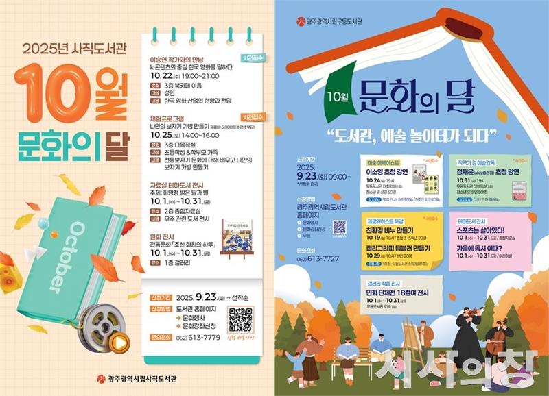 시립도서관 문헌정보과251006_광주광역시립도서관(무등·사직·산수)은 ‘10월 문화의 달’을 맞아 가족들이 도서관에서 함께 즐길 수 있는 강연, 전시, 체험 프로그램 등 ‘도서관, 예술 놀이터가 되다’ 행사를 운영한다.[시사의창=송상교기자]