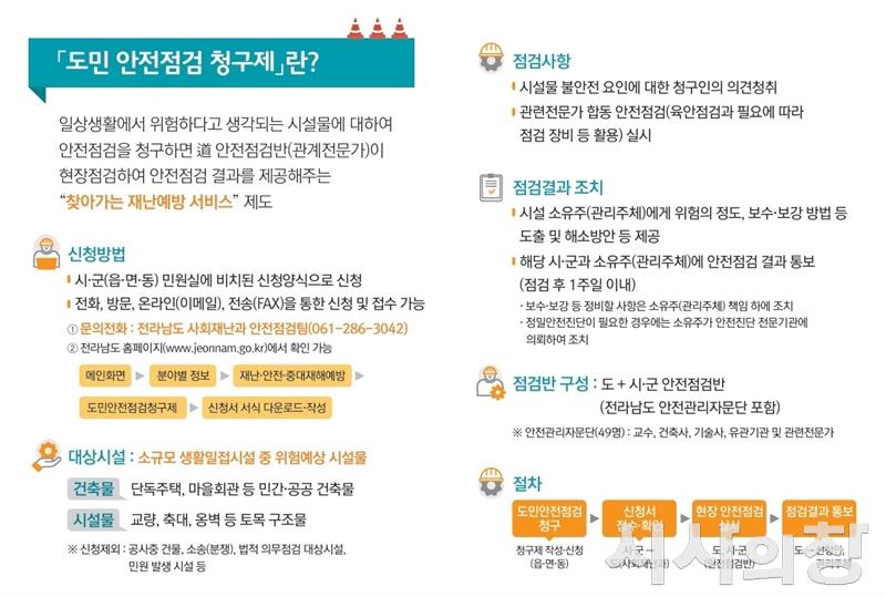 전라남도는 각종 재난으로부터 도민의 생명과 재산을 보호하고 일상 생활주변에 불안전한 위험요소를 찾아 무료로 안전점검하는 ‘도민 안전점검 청구제’를 운영하고 있다고 밝혔다.도민 안전점검 청구제는 도민 누구나 주변 시설이나 구조물 등 위험 요소를 발견했을 경우 해당 시설에 대한 안전점검을 요청할 수 있는 도민 참여형 안전관리 제도다.[시사의창=송상교 기자]