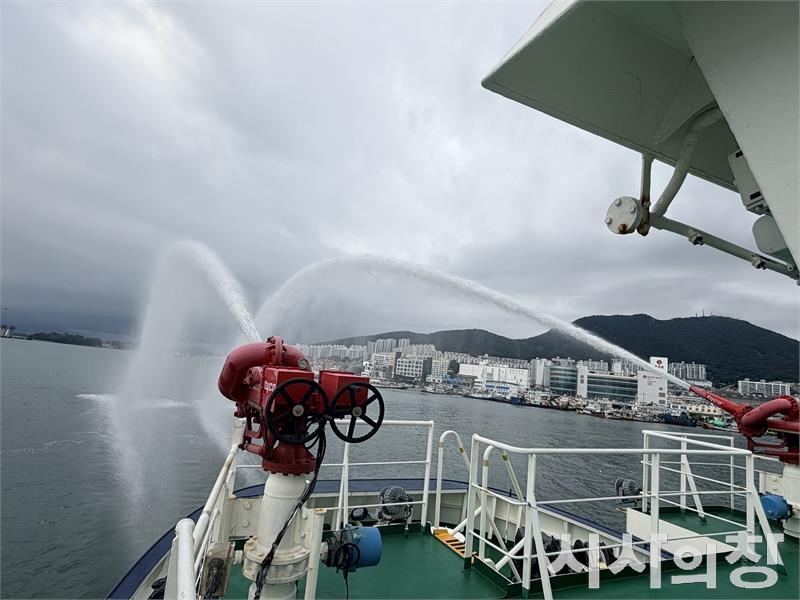 여수해양경찰서는 7일 오전 7시 48분경 여수시 국동 소경도 대합실 인근 해상에서 해양오염이 발생했다는 신고를 접수받고 즉시 현장에 출동해 신속한 방제작업을 실시했다고 밝혔다. 사진은 방제함정에서 소화포 이용 오염물질 방산작업중이다.[시사의창=송상교 기자]