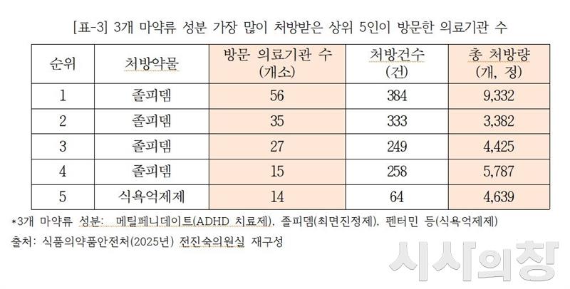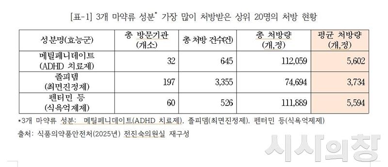 국회 보건복지위원회 전진숙국회의원(더불어민주당·광주 북구을)이 식품의약품안전처로부터 제출받은 ‘2024년 7월~2025년 6월 마약류 의약품 처방현황’ 자료 분석 결과, 주요 마약류 의약품(졸피뎀, 메틸페니데이트, 펜터민 등) 처방 상위 20명 환자 중 다수가 복수의 의료기관에서 수천 정의 약을 처방받은 것으로 확인됐다.