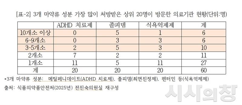 3개 마약류 성분 가장 많이 처방받은 상위 20명이 방문한 의료기관 현황(전진숙 의원실 제공)