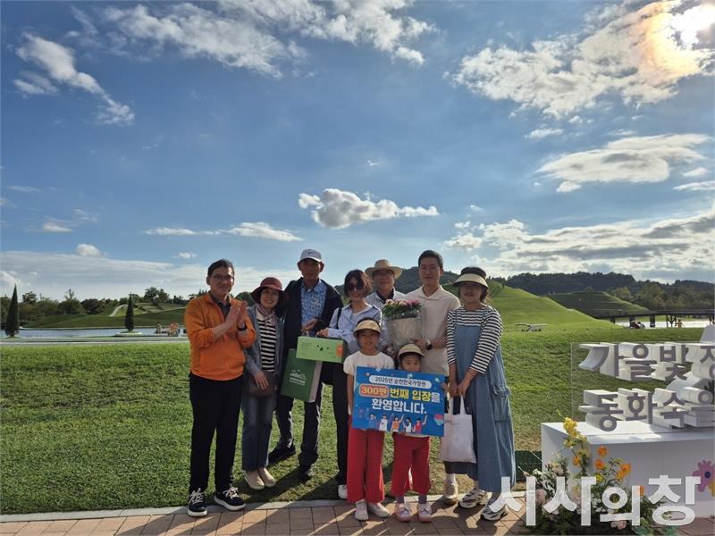 민족 최대 명절 추석을 맞아 순천만국가정원이 다채로운 프로그램과 함께 연휴 내내 관람객들로 북적였다. 올해 추석 연휴에는 하루 평균 5만 명이 넘는 이들이 정원을 찾아 가족·연인·친구와 함께 웃음과 여유를 즐기며 활기찬 명절의 정취를 더했다. 사진은 순천만국가정원 300만 번째 방문관광객(서울시 은평구 3대가족)