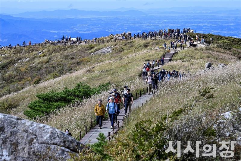 광주광역시는 9일 2년 만에 진행된 무등산 정상 개방 행사가 안전사고 없이 성황리에 마무리됐다고 밝혔다.이날 무등산 정상 개방은 국가AI컴퓨팅센터 광주 유치와 유네스코 세계지질공원 재인증을 기원하고, 시민들의 열망에 부응하고자 마련됐다. 사진은 강기정 광주광역시장이 9일 오전 무등산 정상 개방 행사에 참여해 김이강 서구청장 등 시민들과 서석대에서 지왕봉 정상구간을 오르고 있다.[시사의창=송상교기자]