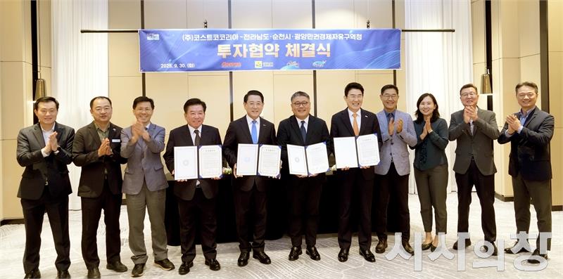 전라남도는 ㈜코스트코코리아의 순천 선월지구 투자 유치를 계기로 소상공인과의 상생발전도 본격 추진한다고 밝혔다. 전라남도는 앞으로 2029년 개점을 목표로 실시계획 변경, 건축심의, 상권영향평가 등 후속 행정절차를 진행할 계획이다.사진은 김영록 전라남도지사가 9월30일 서울 여의도 페어몬트 앰배서더호텔에서 ㈜코스트코코리아-전라남도·순천시·광양만권경제자유구역청 투자협약을 체결하는 모습[시사의창 = 송상교 기자]
