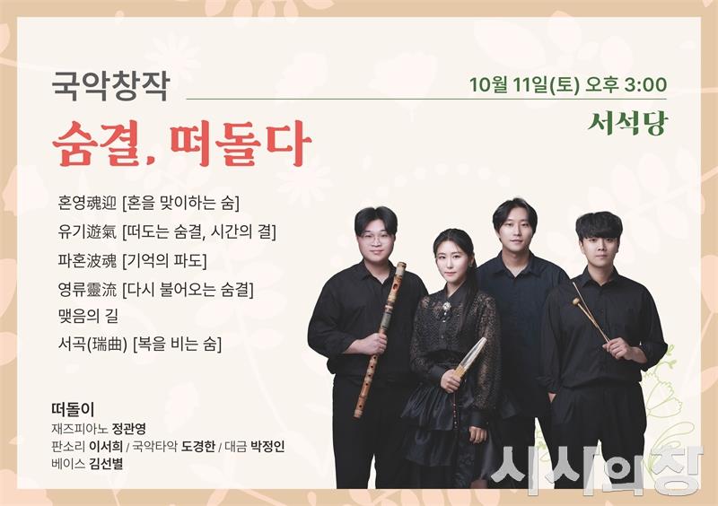 이번 토요 상설공연 ‘숨결, 떠돌다’는 생과 사의 순환을 음악으로 표현한 퓨전국악 무대로, 진도 씻김굿의 음악적 요소를 재해석해 삶과 죽음, 떠남과 순환을 잇는 여정을 담아낸다. 대금·판소리·국악 타악에 재즈 피아노와 일렉 베이스가 어우러져 국악의 정체성과 현대적 감각이 공존하는 음악적 실험무대를 만들어낸다.