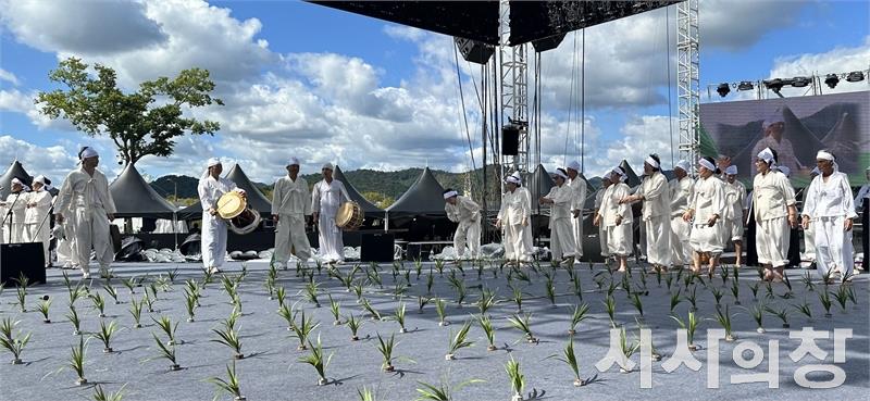 ‘2025 나주영산강축제’ 개막 이튿날은 문화와 예술로 가득 채운 무대들이 펼쳐지며 축제의 열기를 이어갔다.사진은 지역 향토 문화유산 ‘동강봉추들노래’ 공연이 주무대에서 펼쳐져 사라져가는 전통문화의 의미를 되새겼다.[시사의창 = 송상교 기자]