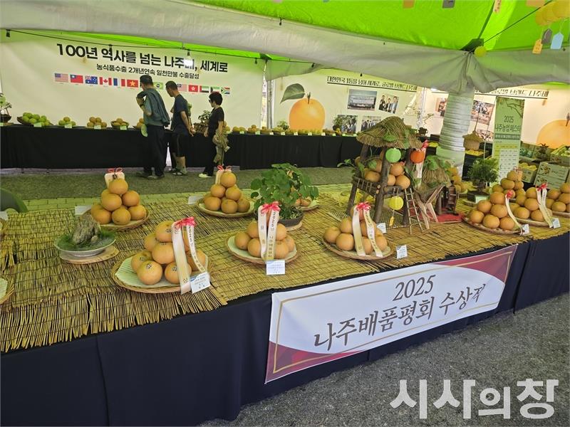 나주시가 ‘2025 나주영산강축제’와 연계해 열리고 있는 ‘나주농업페스타’ 현장에서 나주배 품평회 수상작을 비롯한 다양한 전시와 체험 프로그램을 선보이며 시민과 관광객의 발길을 사로잡고 있다.[시사의창=송상교기자]