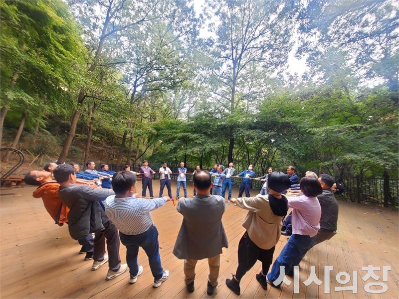 산림청 한국산림복지진흥원 국립나주숲체원은 최근 국립나주숲체원에서 치매어르신 대상 ‘가을소풍’ 행사를 개최했다고 10일 밝혔다. 이번 행사는 한가위를 맞아 숲속치매안심학교에 참여하는 어르신과 가족들에게 소중한 추억을 선사하고자 기획됐다.사진은 숲속치매학교 어르신들이 가을소풍에 참가하여 인지레크리에이션을 함께 하고 있다.[시사의창=송상교기자]