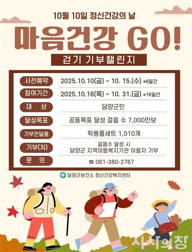 [시사의창 = 송상교 기자] 담양군(군수 정철원)은 "‘세계 정신건강의 날’을 맞아 군민들이 함께 참여하는 ‘마음건강 고(GO)! 걷기 기부챌린지’를 운영한다"고 10일 밝혔다.