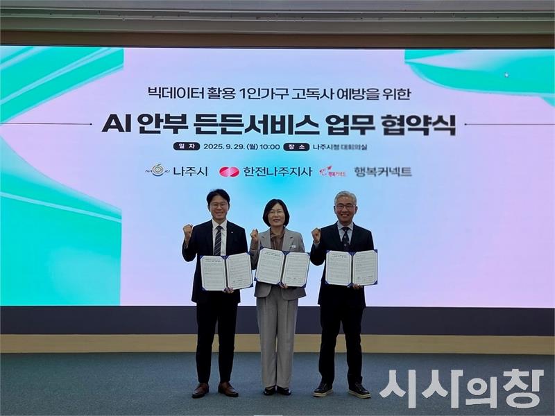 나주시는 최근 한국전력공사 나주지사, SK재단법인 행복커넥트와 함께 1인 가구 사회안전망 강화를 위한 ‘AI안부 든든서비스’ 3자 업무협약을 체결하며 민관공이 함께하는 통합형 사회안전망 구축에 나섰다고 11일 밝혔다.[시사의창=송상교기자]