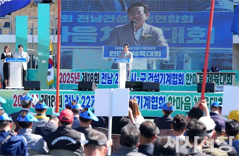 전라남도는 11일 해남 우슬체육관에서 열린 ‘제18회 (사)건설기계개별연명사업자협의회 전라남도회 한마음체육대회’에서 건설기계 산업 종사자들과 소통하며 지역 건설산업의 발전과 상생을 다짐했다고 밝혔다.사진은 김영록 전라남도지사가 11일 해남 우슬체육공원에서 열린 ‘(사)건설기계개별연명사업자협의회 한마음 체육대회’에 참석해 인사말을 하고 있다.[시사의창=송상교기자]
