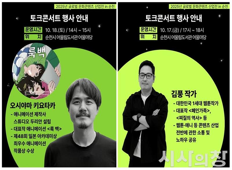 순천시(시장 노관규)는 "오는 17일과 18일 어울림도서관 어울마당에서 김풍 작가와 오시야마 키요타카 감독을 초청한 ‘토크콘서트’를, 이어 18일에는 순천만생태문화교육원에서 ‘2025 순천 뷰티페스타’를 개최한다"고 밝혔다.