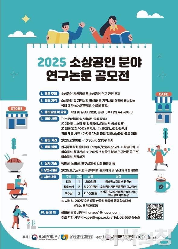 소상공인시장진흥공단은 10월 30일(목)까지 소상공인 정책 관련 신규 아이디어 발굴을 위해 대학생 및 대학원생을 대상으로 「2025년 소상공인 분야 연구논문 공모전」을 개최한다고 밝혔다. 이번 공모전은 한국정책학회와 함께 소상공인 정책 분야의 연구 기반을 확대하고 차세대 연구자들을 육성하며, 향후 정책 개발의 기틀을 마련하기 위해 마련되었다.[시사의창=송상교기자]