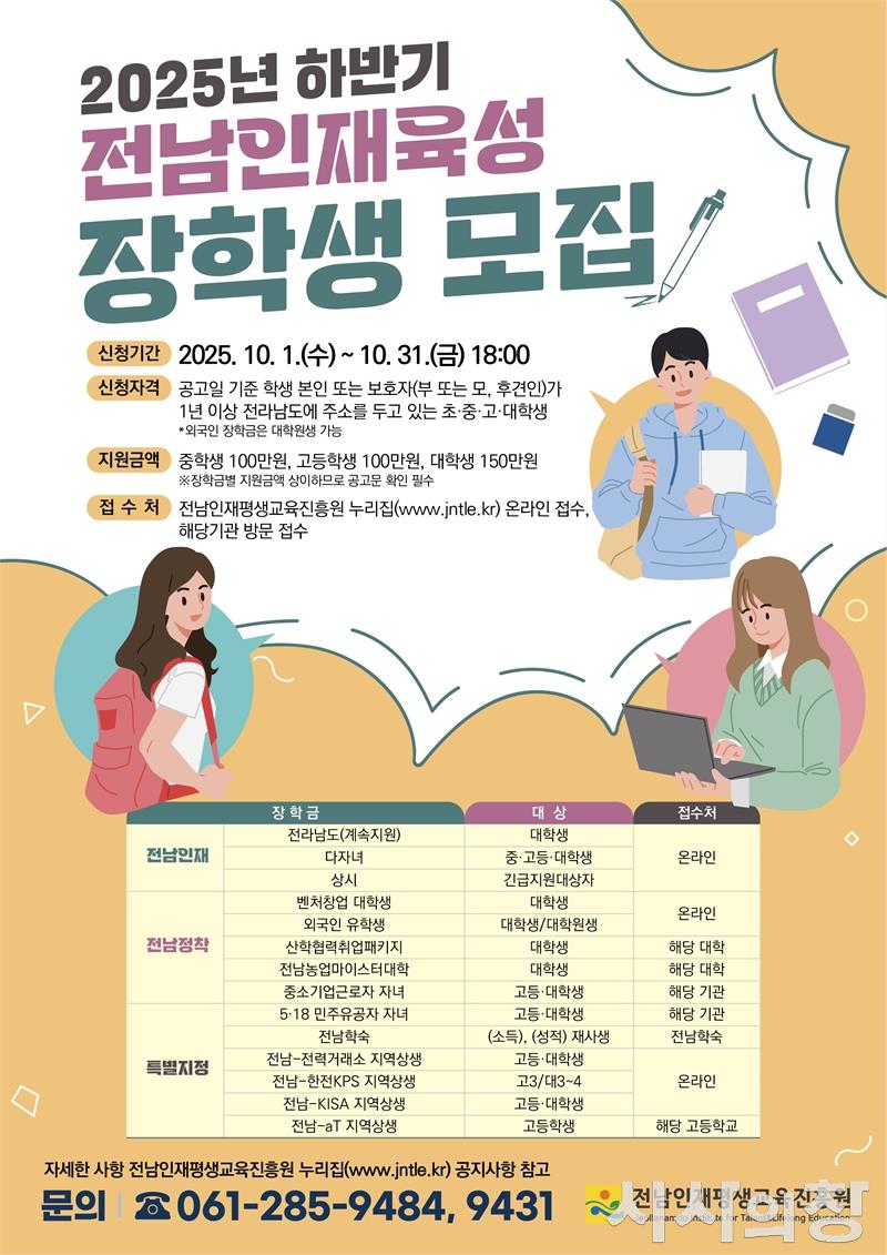 전라남도와 전남인재평생교육진흥원은 실질적인 교육기회 보장과 미래인재로의 성장, 지역 정착을 지원하기 위한 2025년 하반기 전남인재육성 장학생을 오는 31일까지 모집한다.[시사의창=송상교기자]